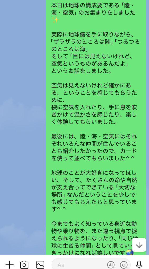 今日は、地球の構成要素「陸・海・空気」について種まきをしてきました。