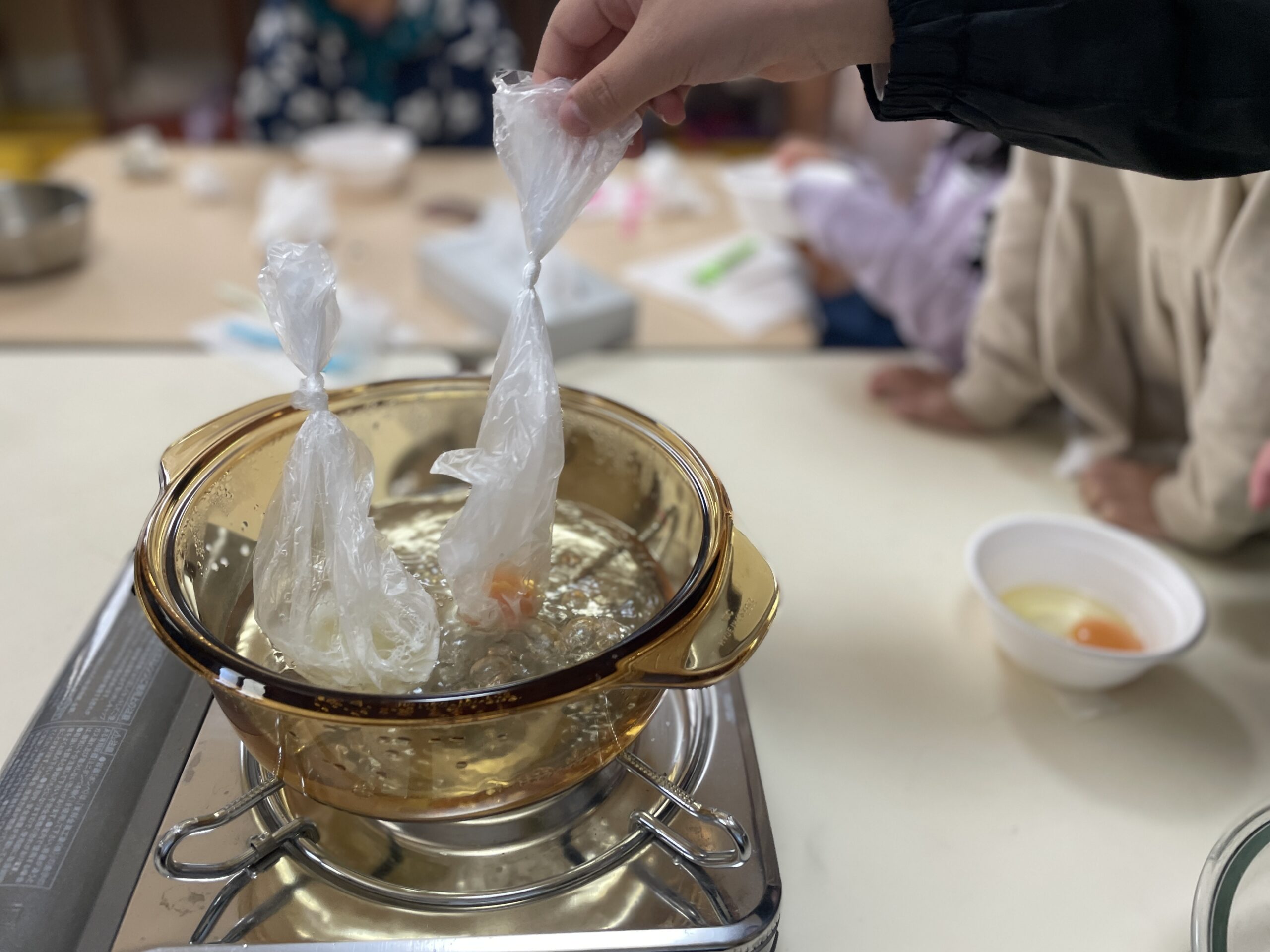 2人で卵を割って、